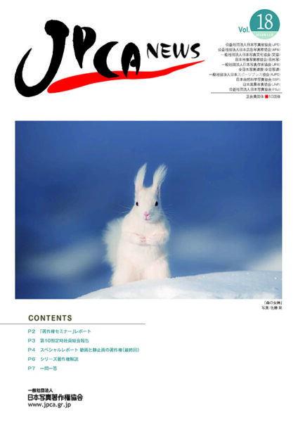 2018.12.15 JPCA NEWS 第18号 JPCA NEWS JPCA NEWS ダウンロード P2 「著作権セミナー」レポート P3 第10期定時社員総会報告 P4 スペシャルレポート 動画と静止画の著作権(最終回) P6 シリーズ著作権解説 P7 一問一答 JPCA NEWS 第17号 前の記事 著作権法47条に関するガイドラインが合意されました(2019年1月22日策定) 次の記事 特集記事 2024.08.01 フォトコンテスト主催者の皆さまへ 2023.08.17 生成AIに関する共同声明 2019.02.06 著作権法47条に関するガイドラインが合意されました(2019年1月22日策定) 2013.12.26 緊急声明 「言論・表現の自由」を侵害する「特定秘密保護法案」に反対します 2010.12.01 デジタル雑誌配信の権利処理ガイドラインについて 2009.08.27 「Google・ブック検索訴訟の和解案」に対する声明 最近の記事 ギャラリー 田沼武能 2025.12.29 年末年始休業のお知らせ 2025.12.1 26/2/22開催 写真著作権セミナーのご案内 2025.11.22 写真著作権テキストブック『考える写真著作権』第2版を発行しました 2025.11.21 写真著作権セミナー 東川町フォト・フェスタ2025のご案内 2025.07.11