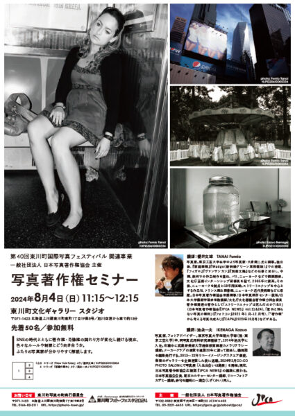 2024.07.14 第40回東川町国際写真フェスティバル関連事業 写真著作権セミナーのご案内 セミナー 主催: JPCA-日本写真著作権協会 SNSの時代とともに著作権・肖像権の関わり方が変化し続ける現在、色々なルールや制限とどう向き合うか。 ふたりの写真家が分かりやすく解説します。 開催日時 2024年8月4日(日)11:15~12:15 会場 東川町文化ギャラリー スタジオ 〒071-1423 北海道上川郡東川町東町1丁目19番8号/旭川空港から車で約13分 講師 棚井文雄 池永一夫 受講申込 要予約先着50名/参加無料 備考 第4回 知っておきたい写真著作権&肖像権セミナー・名古屋のご案内 前の記事 フォトコンテスト主催者の皆さまへ 次の記事